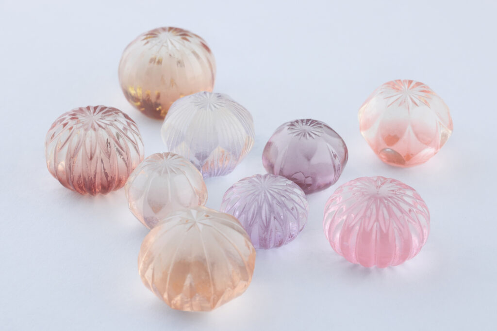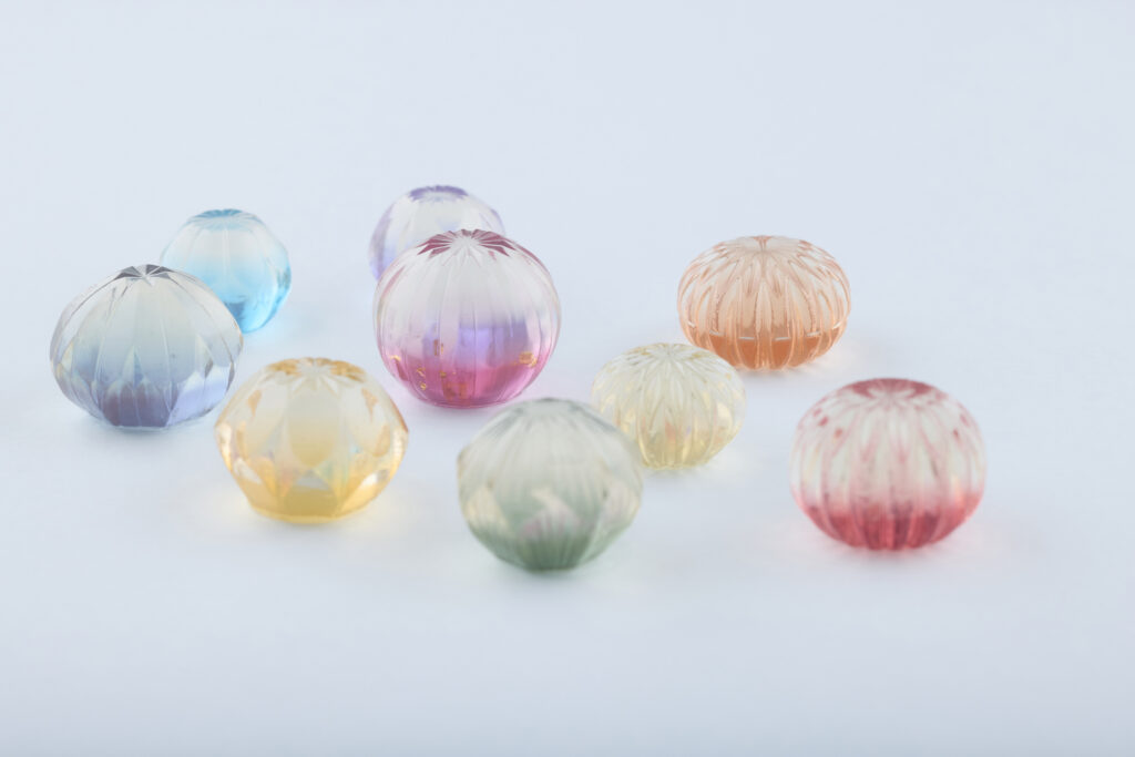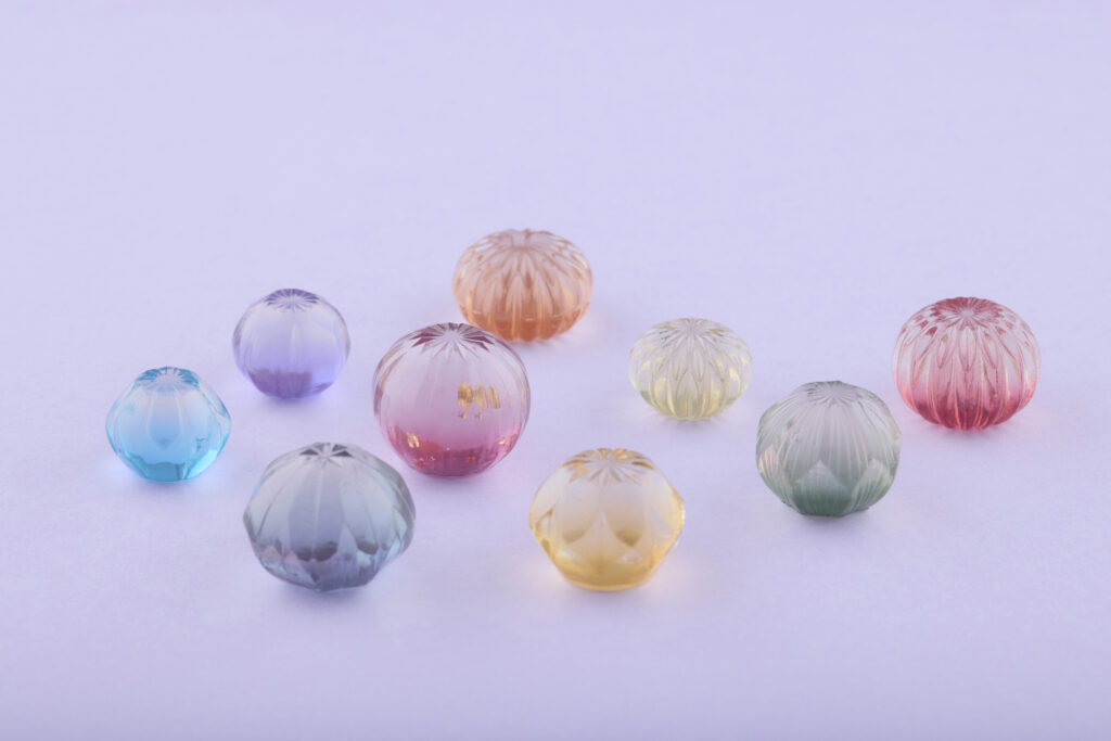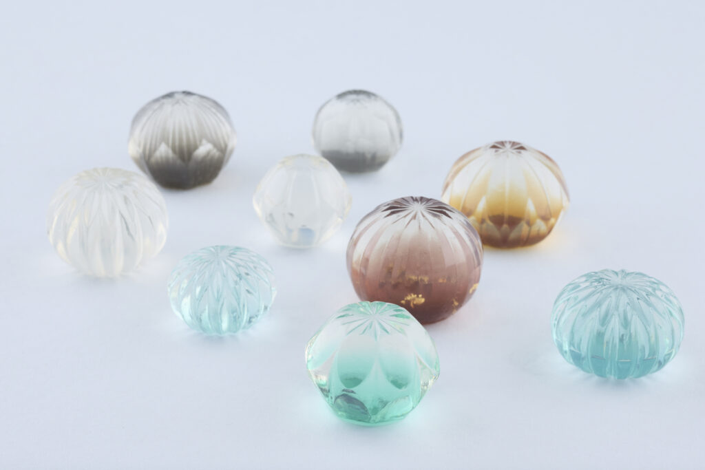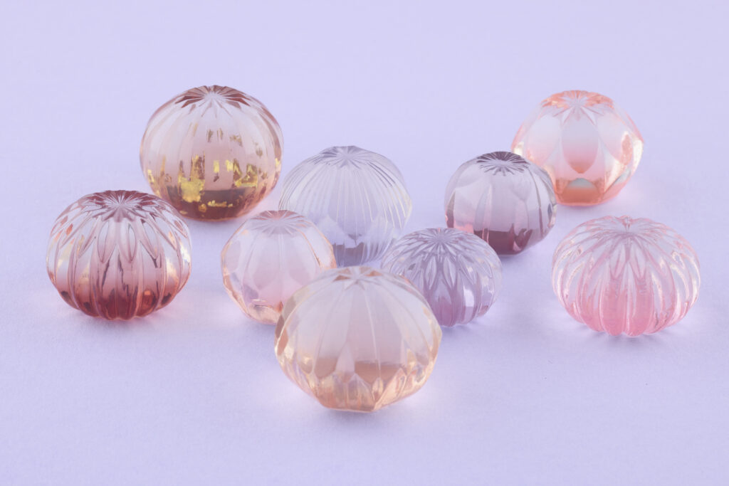 この和菓子は、山本真衣の硝子作品シリーズ「Breeze ブリーズ」に、五郎丸屋16代目渡邉克明が触発されたことから生まれました。作品の造形を琥珀糖で、できるだけ精密に再現。淡く繊細な色合いは様々なカクテルによって表現されており、見る角度によって表情がきらきらと変化します。