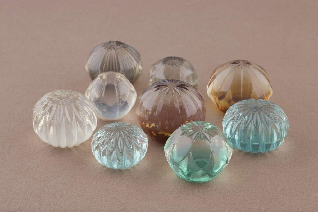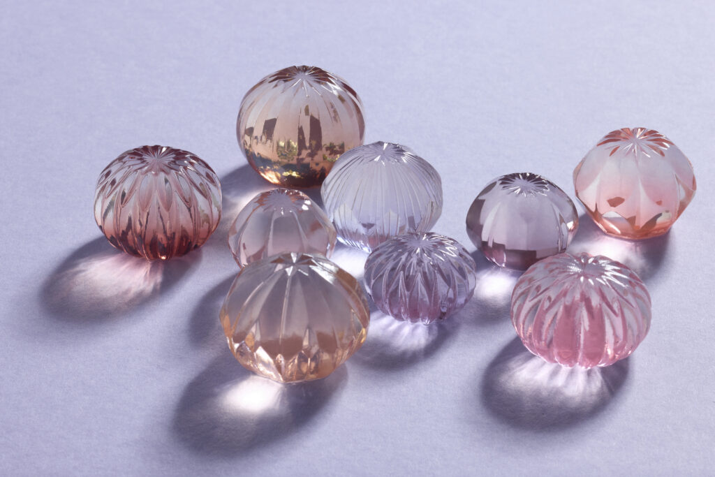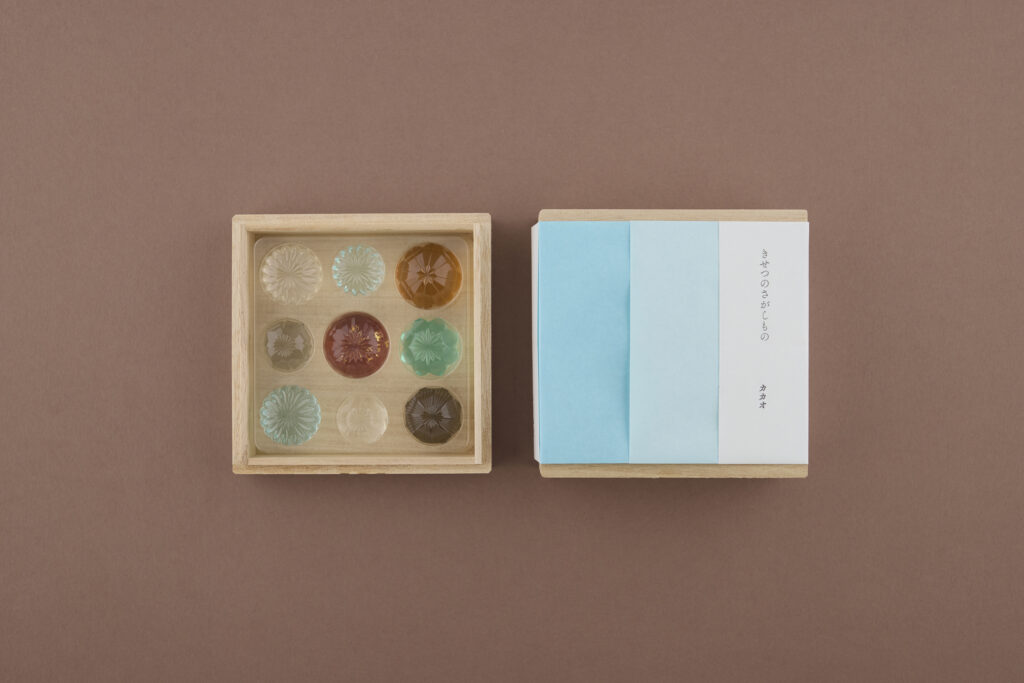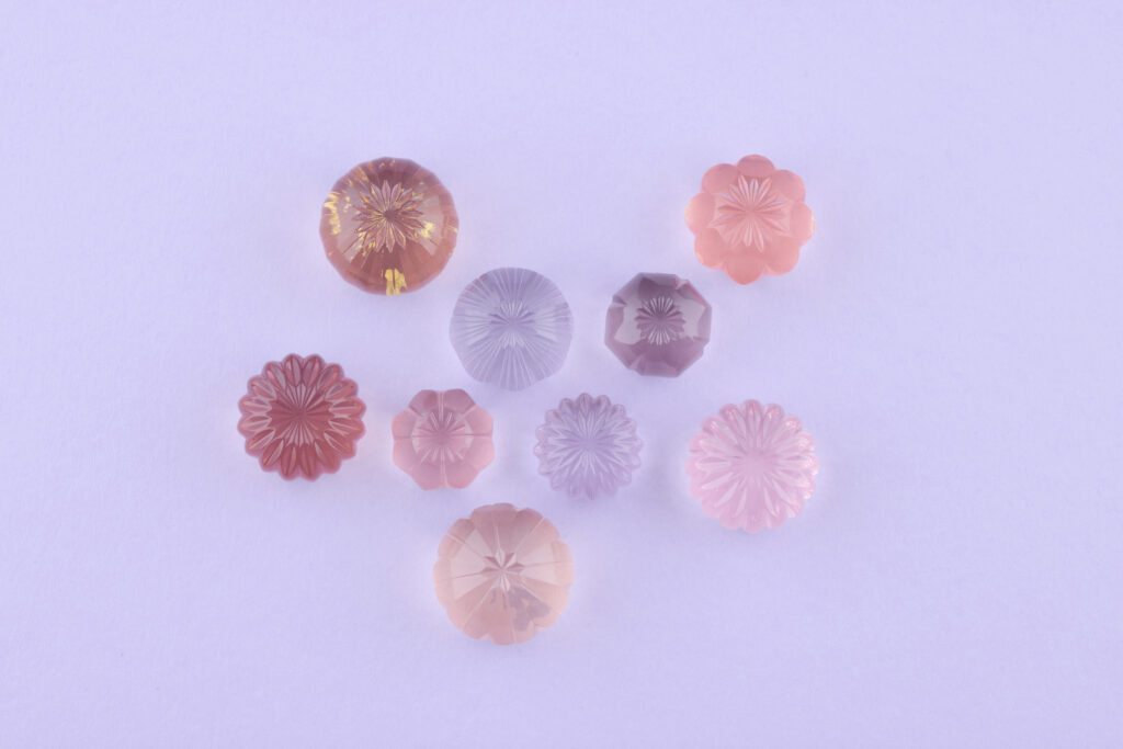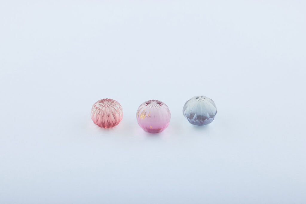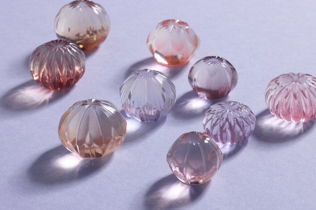 この和菓子は、山本真衣の硝子作品シリーズ「Breeze ブリーズ」に、五郎丸屋16代目渡邉克明が触発されたことから生まれました。作品の造形を琥珀糖で、できるだけ精密に再現。淡く繊細な色合いは様々なカクテルによって表現されており、見る角度によって表情がきらきらと変化します。